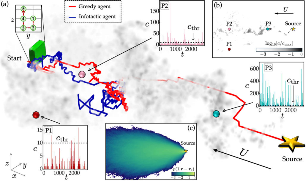 Setup for collective olfactory search with policy heterogeneity: (a) Snapshot of the concentration of odor particles (logarithmic grayscale) emitted by the source (yellow star), obtained by the direct numerical simulations of a turbulent flow. The blue (red) curves correspond to the typical trajectories of an infotactic (greedy) agent starting from the region indicated by the green box and cooperating to find the source. Agents are initially placed close to each other, as depicted in the top-left inset. Three plots (P1-P3) display the intermittent time evolution of the odor signal at the point indicated by the arrow. Agents can detect odor particles when their number is above a given treshold. Search starts when at least one agent detects an odor signal. U denotes the mean wind. (b) Two-dimensional snapshot of the concentration of odor particles within a thin slab parallel to the mean wind U containing the source. Points P1, P2, and P3 are also reported here using the same color scheme as in the rest of the figure. (c) Two-dimensional cut of the probability map of making a detection in the plane parallel to the mean wind U and containing the source. This map, constituting the environment model the agents use to interpret their observations (empirical likelihood), is obtained by coarse-graining all the odors’ trajectories, thresholding on the number of detectable particles, and finally averaging over time. From Ref.[1].